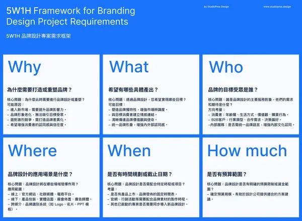 在著手品牌設(shè)計或重塑合作之前,清晰地界定需求與目標是至關(guān)重要的第一步。我建議借助 5W1H(Why / What / Who / Where / When / How much)的框架,初步梳理需求,以便在與品牌設(shè)計公司溝通時,能夠簡潔且全面地介紹當前情況。
